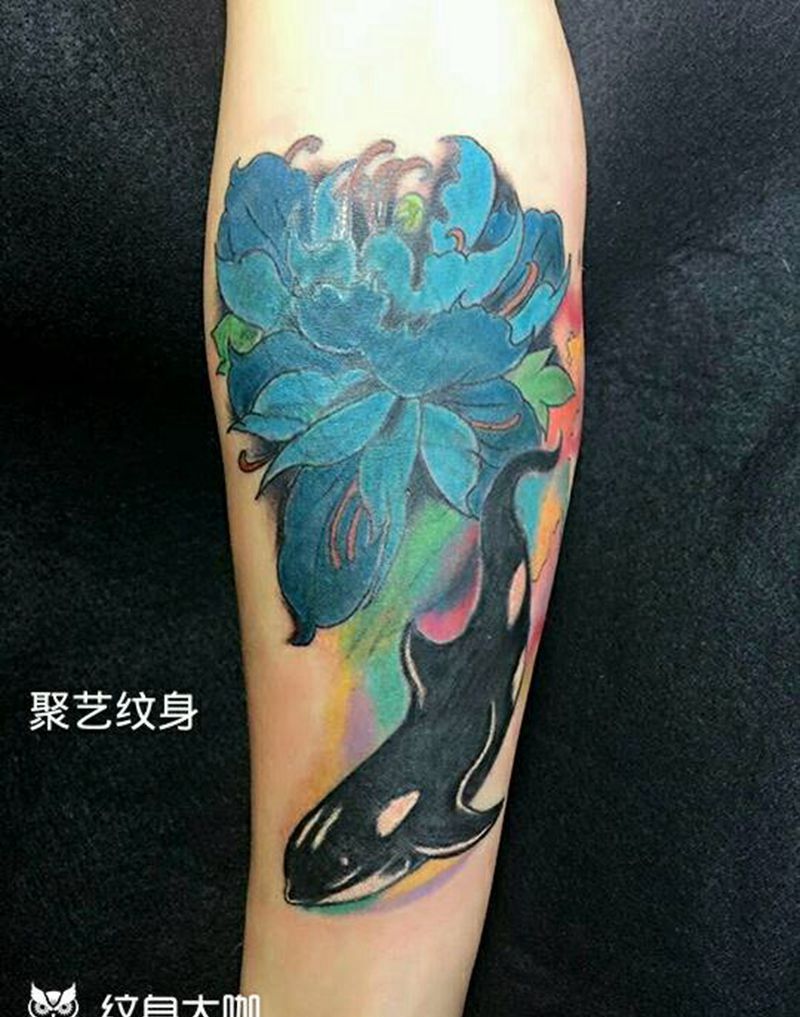 当前位置: 首页 >天津市纹身店-聚艺纹身纹身图案>炫彩鲸鱼花纹身图片_手臂欧美动物植物成品纹身图案