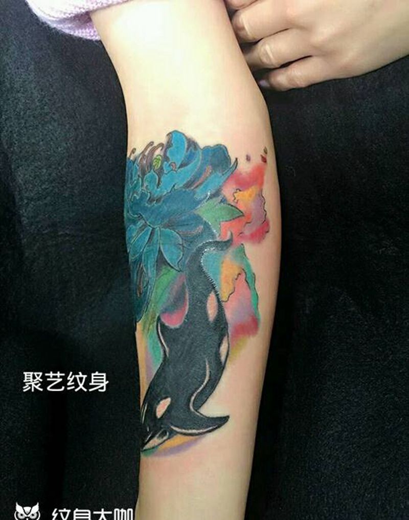 当前位置: 首页 >天津市纹身店-聚艺纹身纹身图案>炫彩鲸鱼花纹身图片_手臂欧美动物植物成品纹身图案