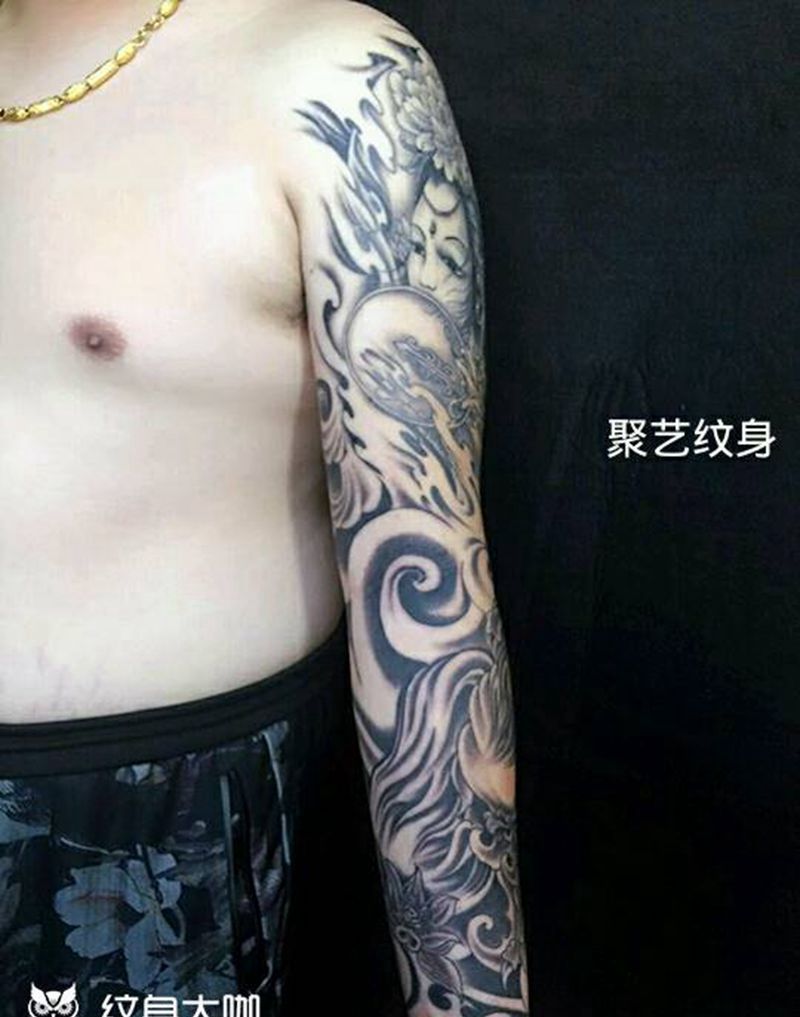当前位置: 首页 >天津市纹身店-聚艺纹身纹身图案>艺妓唐狮花臂纹身图片_手臂传统动物人物成品纹身图案