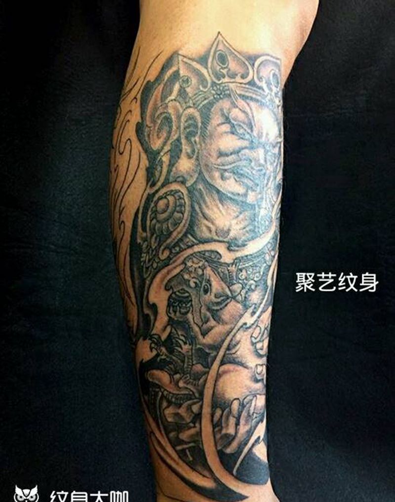 当前位置: 首页 >天津市纹身店-聚艺纹身纹身图案>包腿天王纹身图片_腿部传统人物鬼神宗教成品纹身图案