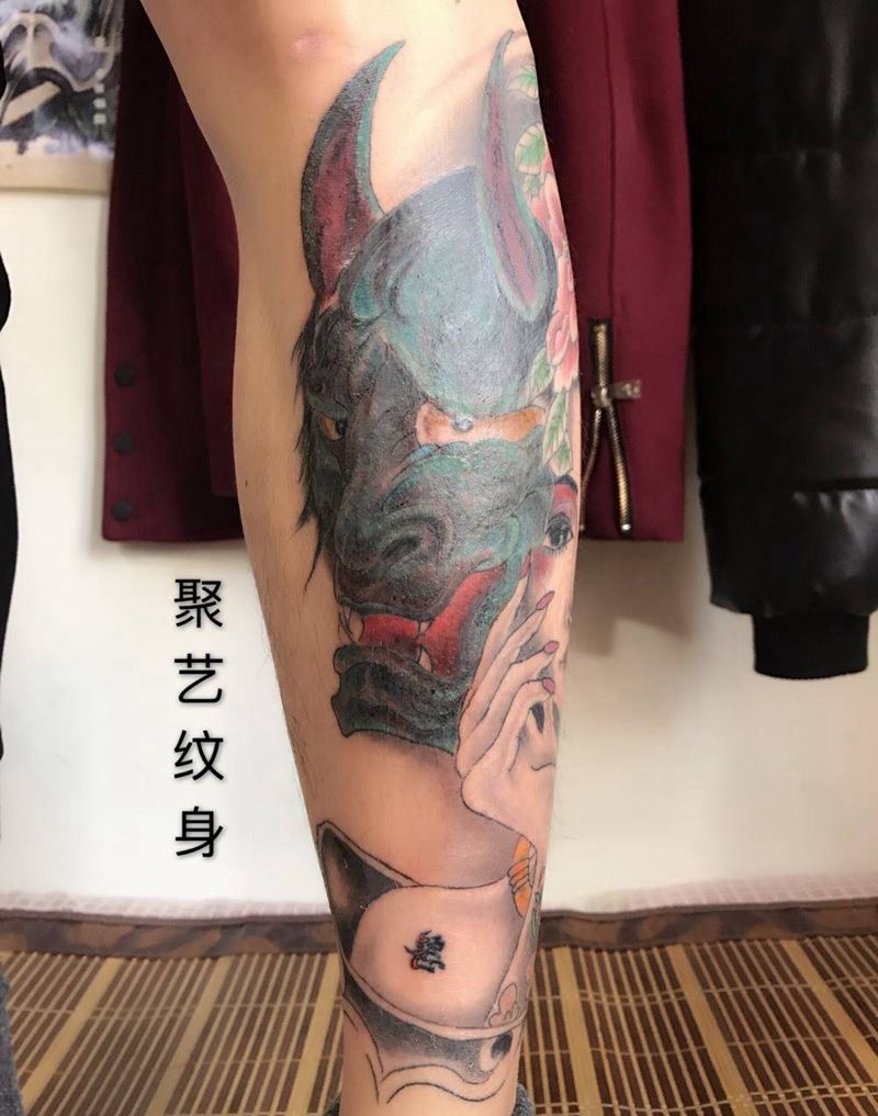 当前位置: 首页 >天津市纹身店-聚艺纹身纹身图案>小腿艺妓纹身图片_成品腿部传统人物鬼神纹身图案