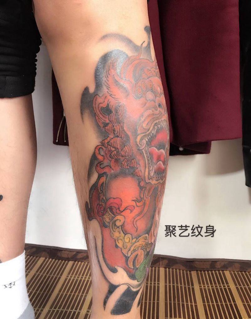 当前位置: 首页 >天津市纹身店-聚艺纹身纹身图案>小腿唐狮纹身图片_成品腿部传统动物纹身图案