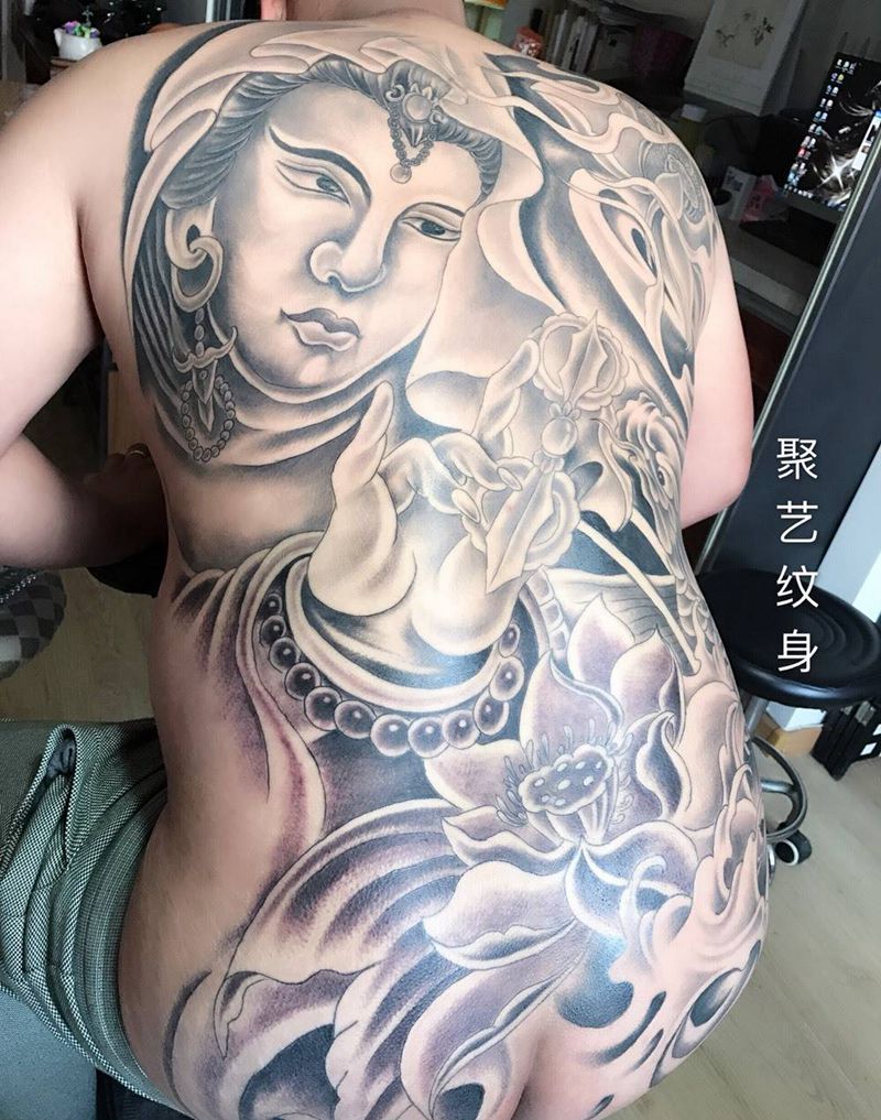 当前位置: 首页 >天津市纹身店-聚艺纹身纹身图案>满背观音祥鱼纹身图片_