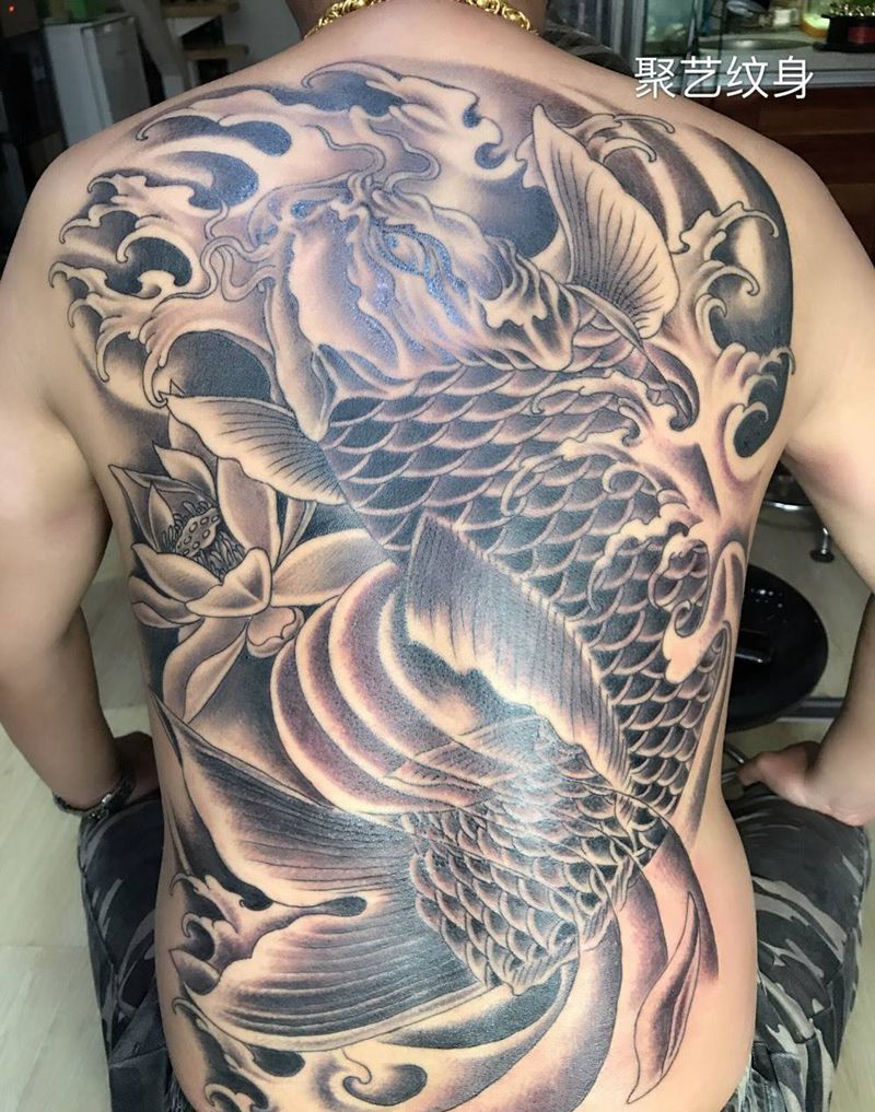 满背鲤鱼纹身图片_成品背部传统动物纹身图案