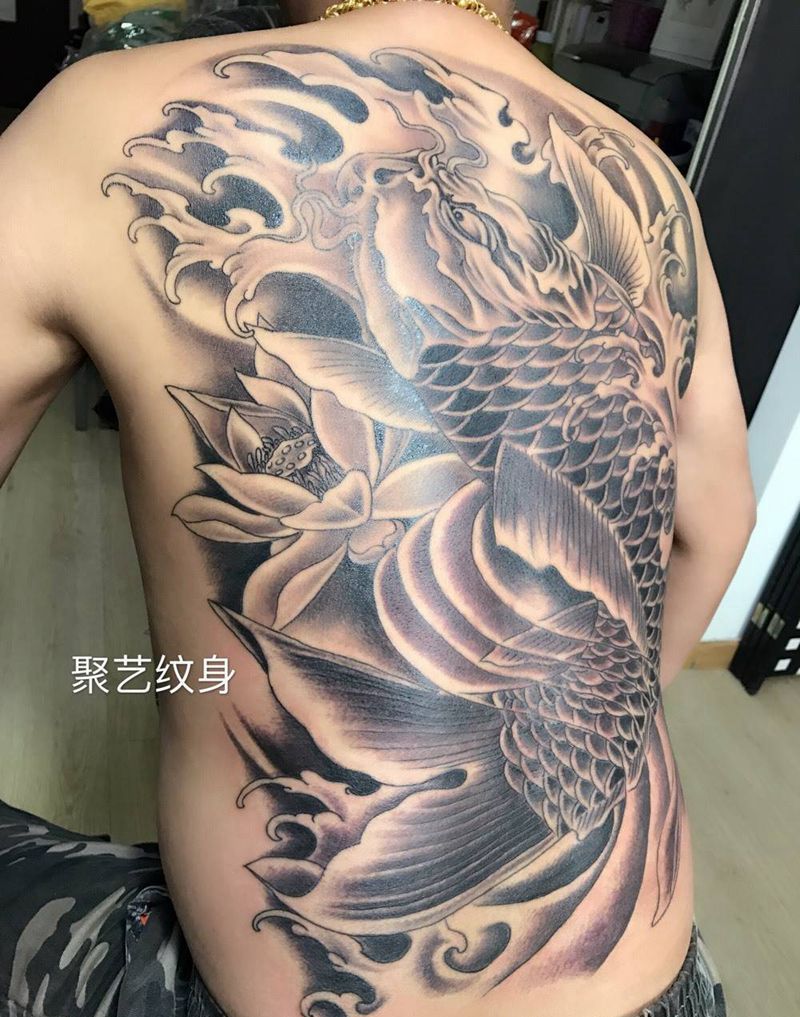 当前位置: 首页 >天津市纹身店-聚艺纹身纹身图案>满背鲤鱼纹身图片_成品背部传统动物纹身图案