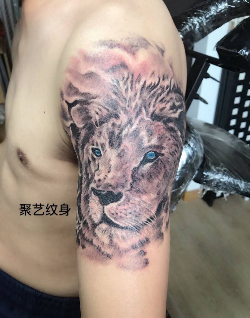 当前位置: 首页 >天津市纹身店-聚艺纹身纹身图案>写实狮子纹身图片_成品手臂肖像动物纹身图案