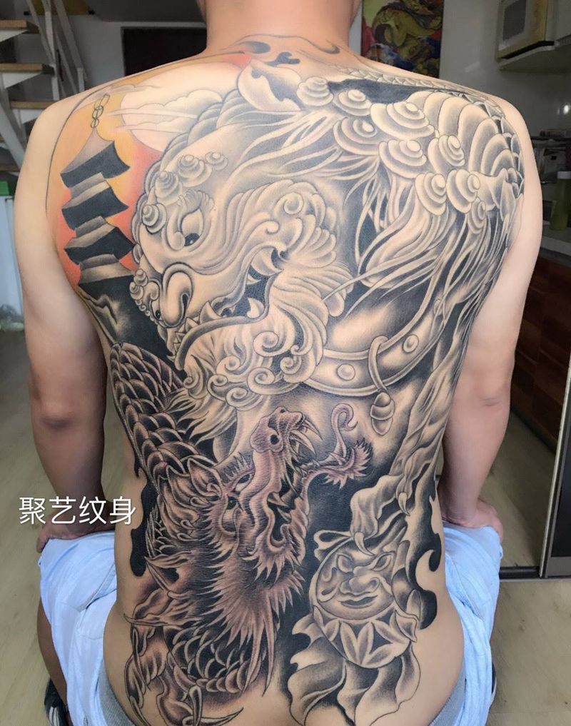 当前位置: 首页 >天津市纹身店-聚艺纹身纹身图案>唐狮祥龙纹身图片_成品背部传统动物鬼神纹身图案