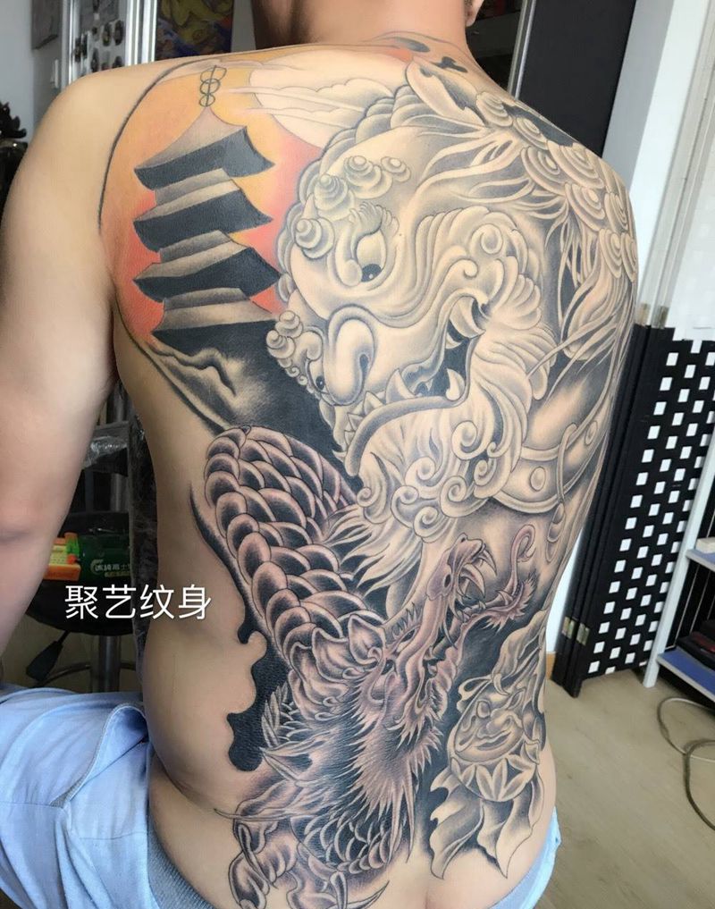 当前位置: 首页 >天津市纹身店-聚艺纹身纹身图案>唐狮祥龙纹身图片_成品背部传统动物鬼神纹身图案