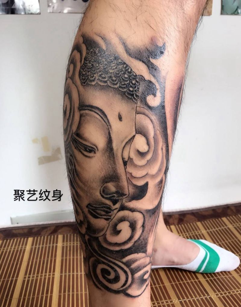 包小腿佛头莲花纹身图片_成品腿部传统人物植物纹身图案