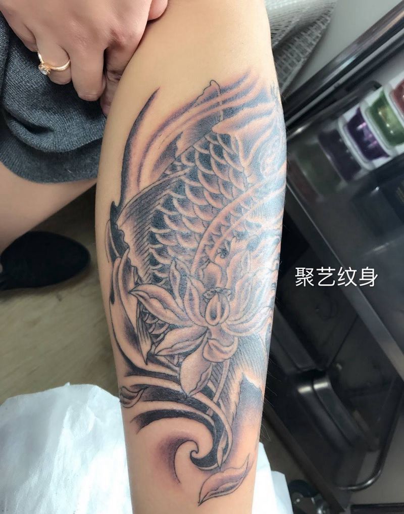 小腿富贵鱼纹身图片_成品腿部传统动物纹身图案