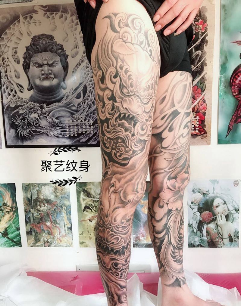 • T网红王老大花腿龙纹身图片_腿部新传统纹身图案