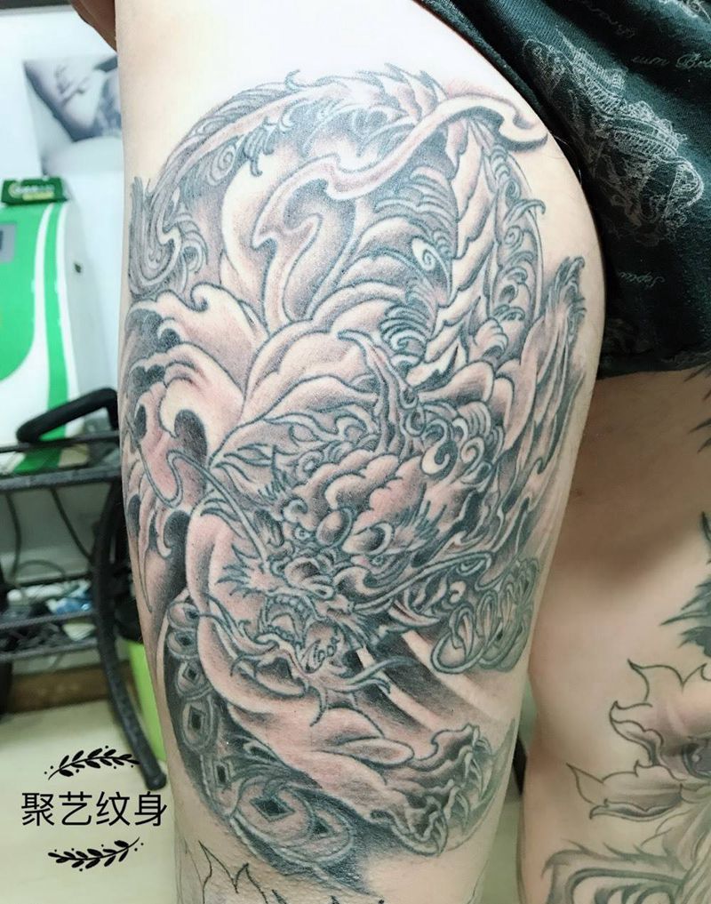 • T网红王老大花腿龙纹身图片_腿部新传统纹身图案