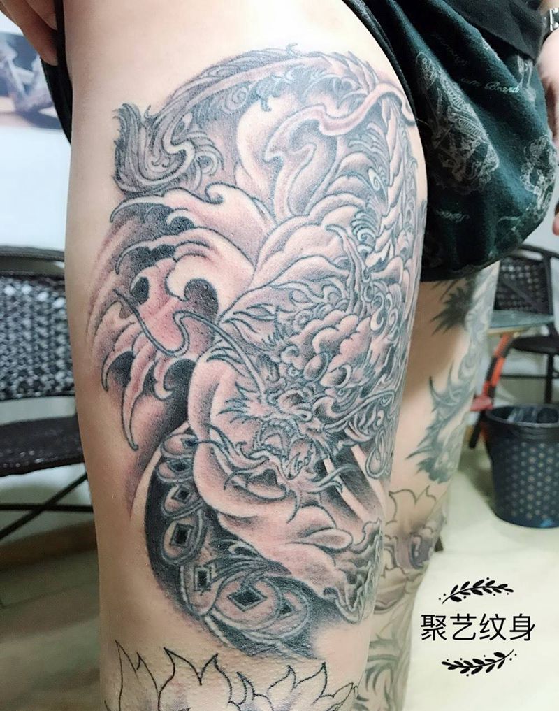 • T网红王老大花腿龙纹身图片_腿部新传统纹身图案
