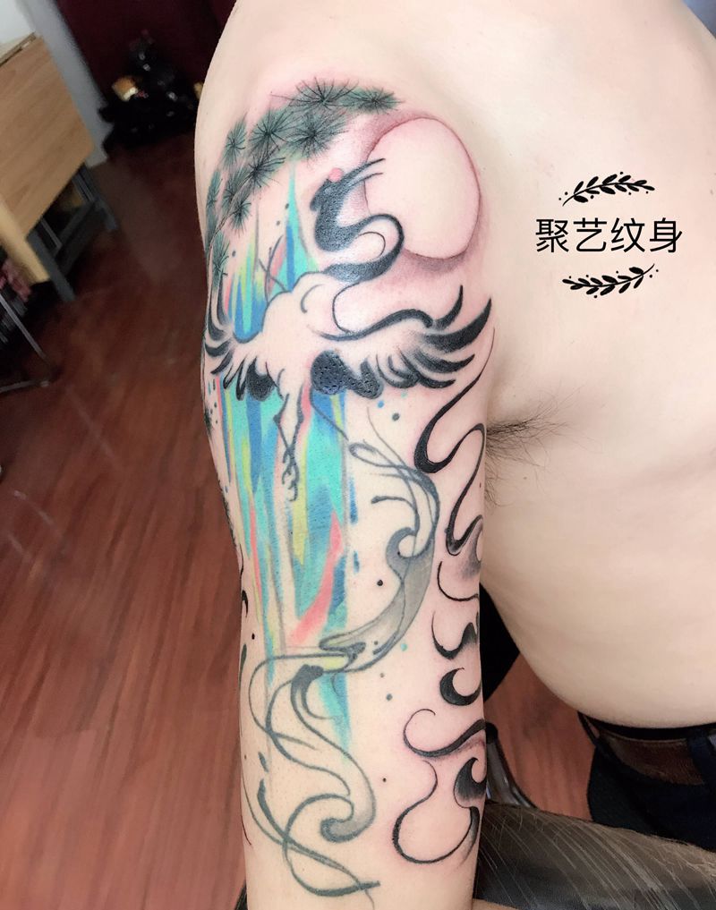 水彩松鹤延年纹身图片_手臂水彩纹身图案