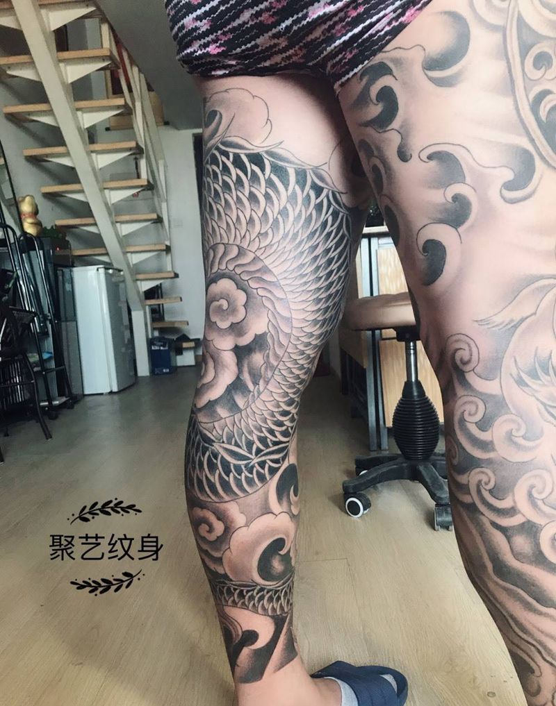 • T网红王老大花腿龙纹身图片_腿部新传统纹身图案