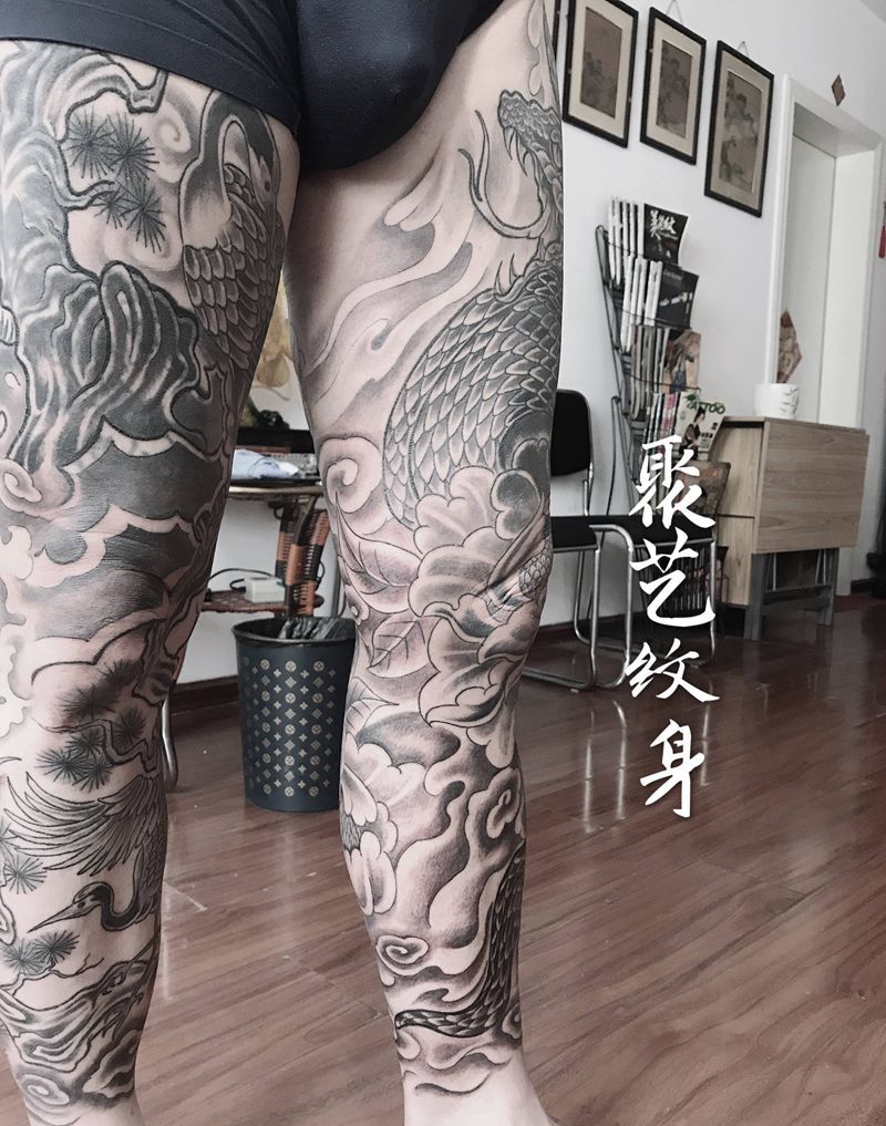 • T网红王老大花腿龙纹身图片_腿部新传统纹身图案