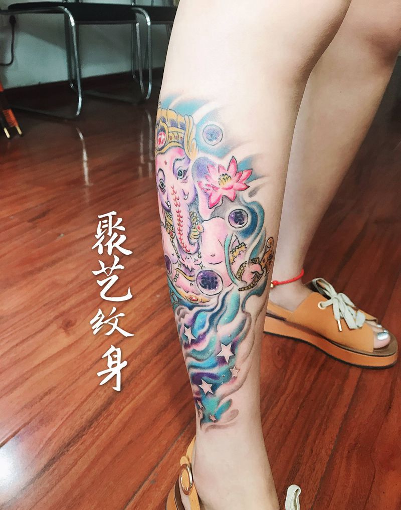 当前位置: 首页 >天津市纹身店-聚艺纹身纹身图案>彩色象神纹身图片_腿部纹身图案