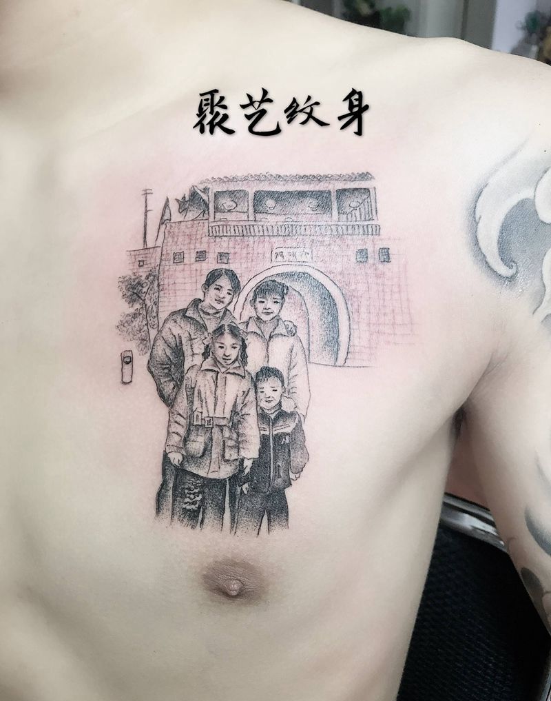 当前位置: 首页 >天津市纹身店-聚艺纹身纹身图案>肖像全家福纹身图片_胸部纹身图案