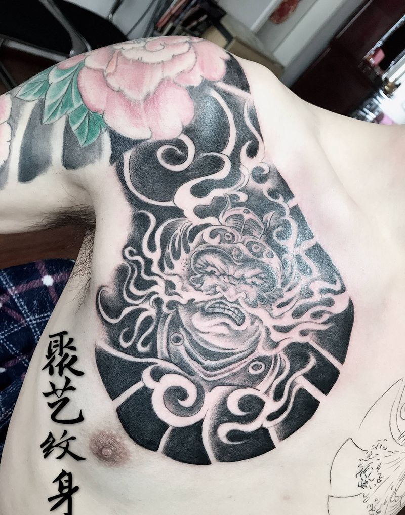 接半甲 哼哈二将纹身图片_胸部纹身图案