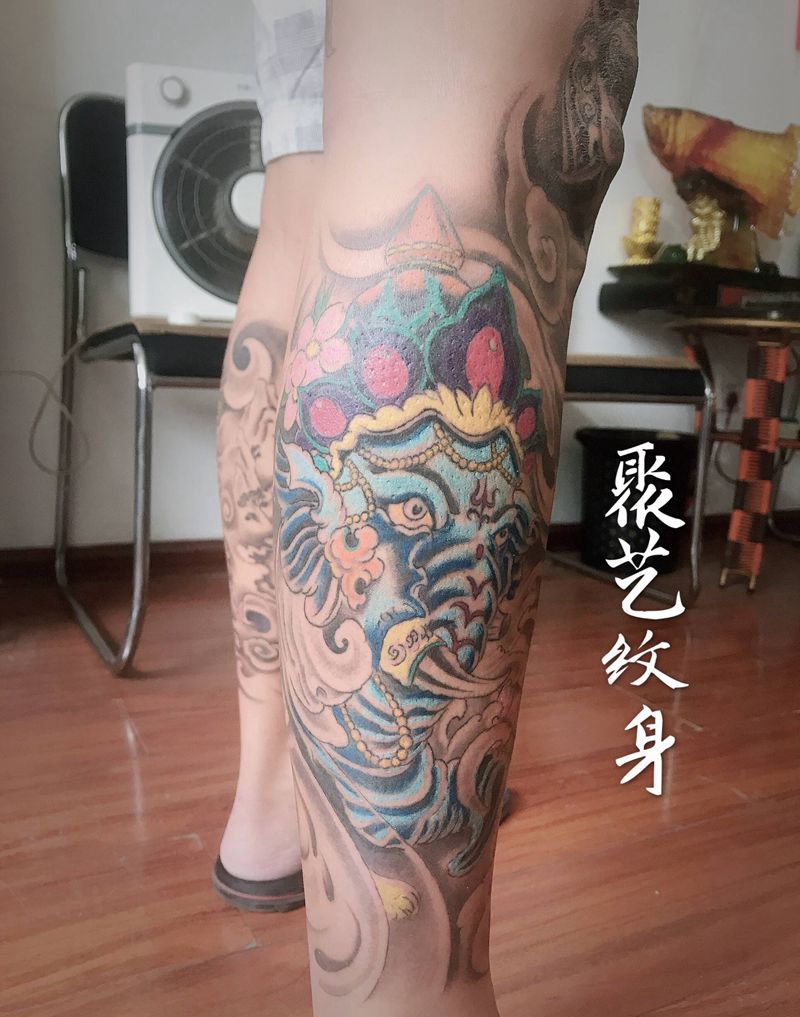 当前位置: 首页 >天津市纹身店-聚艺纹身纹身图案>包腿彩色象神莲花纹身图片_腿部纹身图案