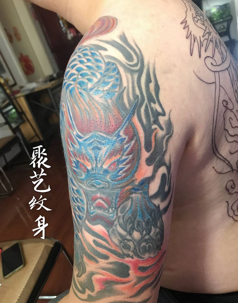 当前位置: 首页 >天津市纹身店-聚艺纹身纹身图案>老旧纹身添加彩色麒麟纹身图片_手臂纹身图案