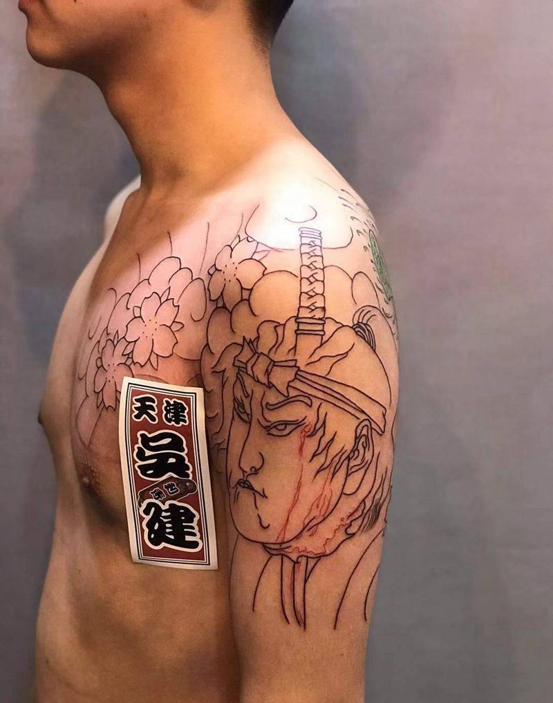 当前位置: 首页 >天津市纹身店-天津吴建刺青纹身图案>半甲纹身图片_肩部手臂老传统纹身图案