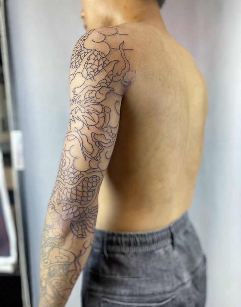 • T网红王老大花腿龙纹身图片_腿部新传统纹身图案