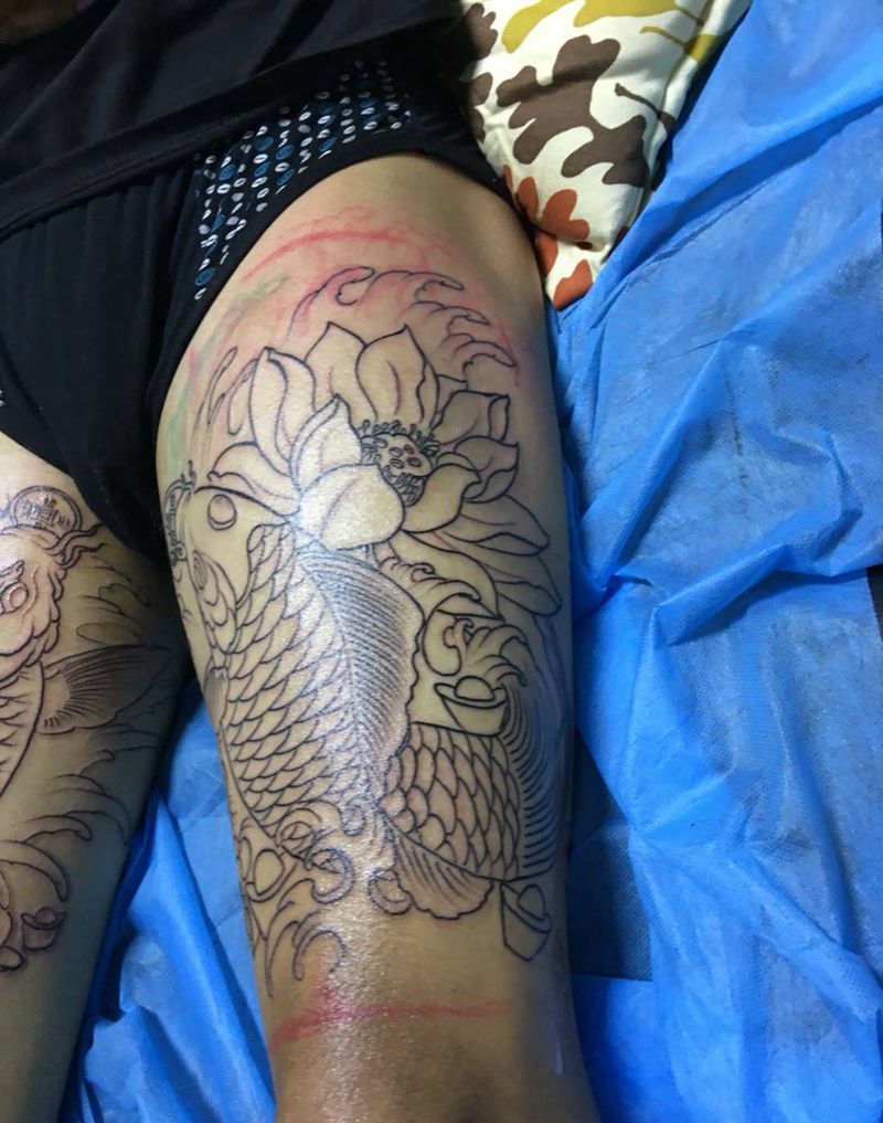 当前位置: 首页 >天津市纹身店-晟堂刺青工作室纹身图案>大腿鲤鱼割线纹身图片_
