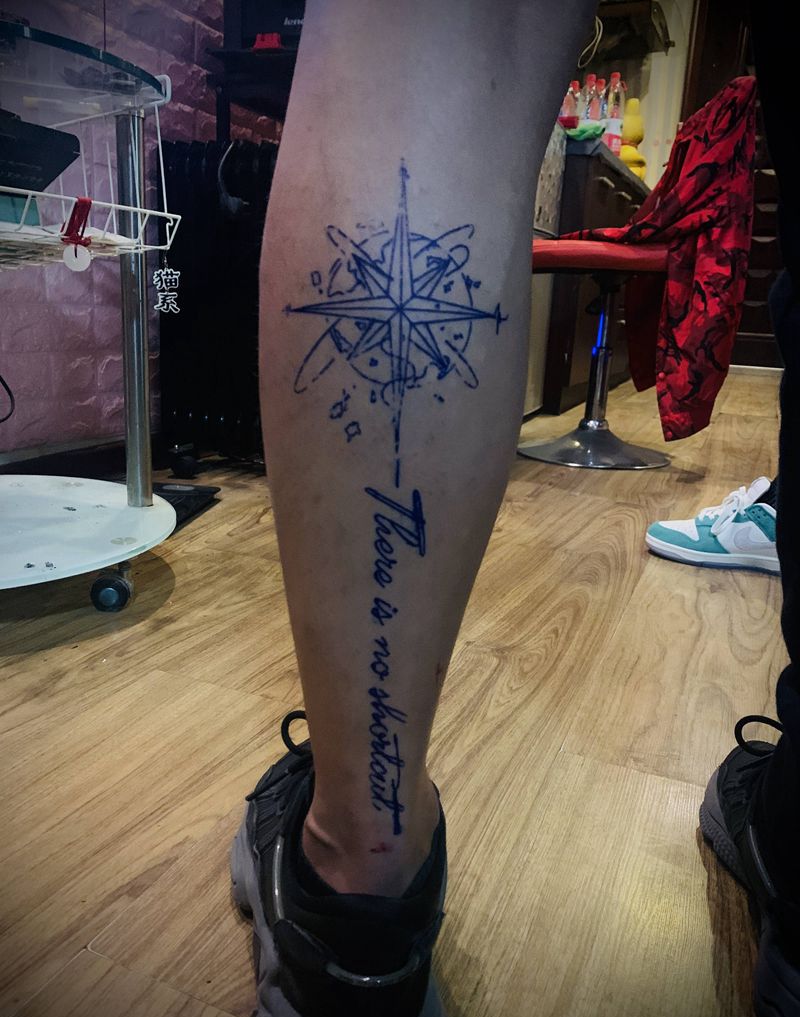 当前位置: 首页 >天津市纹身店-皆刺青纹身工作室纹身图案>小腿后侧指南针英文纹身图片_腿部花体字点刺指南针字母纹身图案