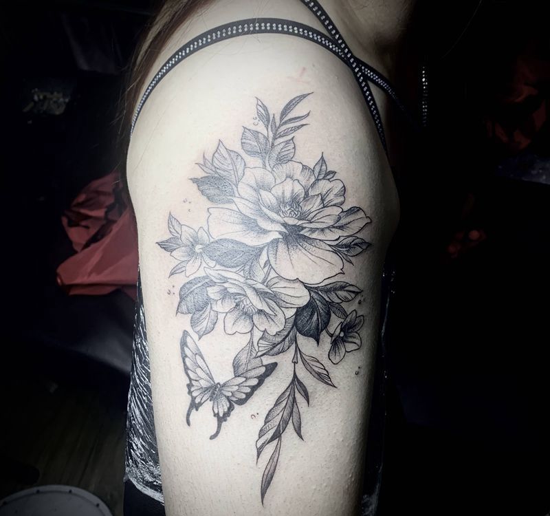 当前位置: 首页 >天津市纹身店-皆刺青纹身工作室纹身图案>大臂外侧素花蝴蝶纹身图片_手臂点刺几何素花蝴蝶纹身图案