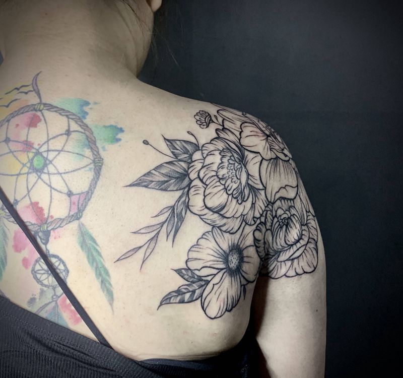 当前位置: 首页 >天津市纹身店-皆刺青纹身工作室纹身图案>原创肩膀大面积素花牡丹纹身图片_肩部胸部点刺几何素花牡丹纹身图案