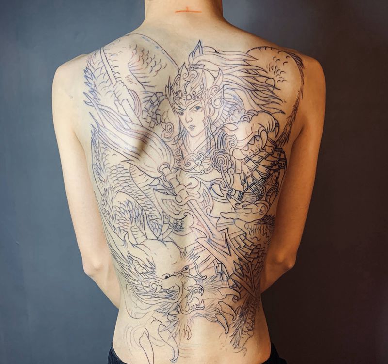 满背赵云割线未完纹身图片_背部老传统新传统传统人物赵云龙纹身图案