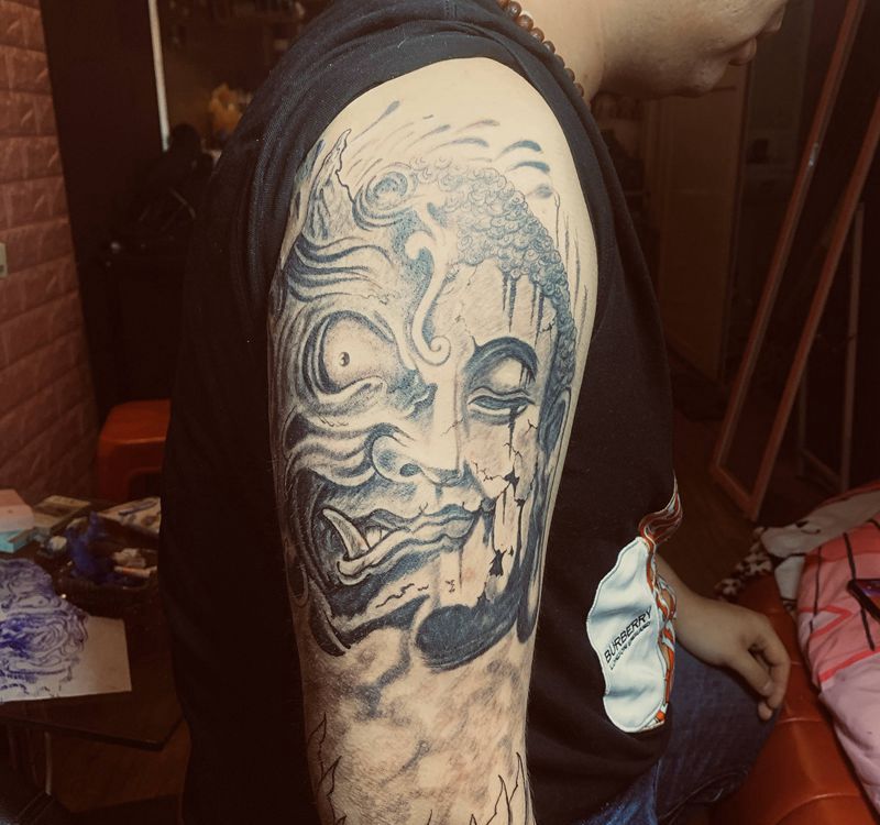 当前位置: 首页 >天津市纹身店-皆刺青纹身工作室纹身图案>石雕一念之间纹身图片_臀部手臂老传统新传统一念之间佛魔纹身图案