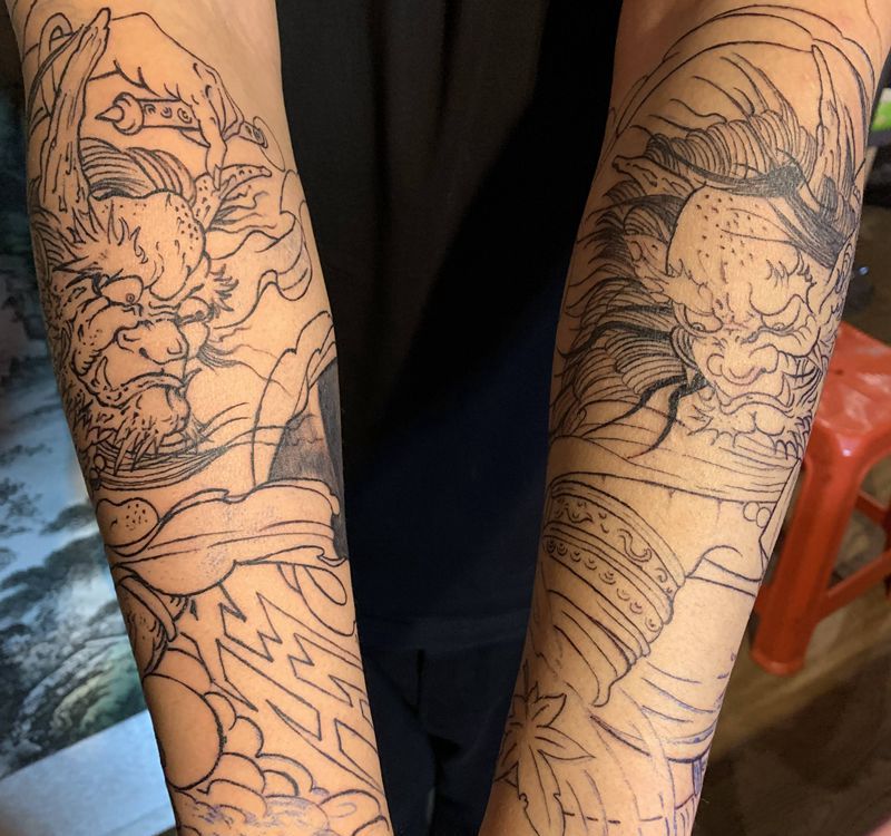 当前位置: 首页 >天津市纹身店-皆刺青纹身工作室纹身图案>风神雷神接花臂未完纹身图片_手臂老传统风神雷神花臂纹身图案