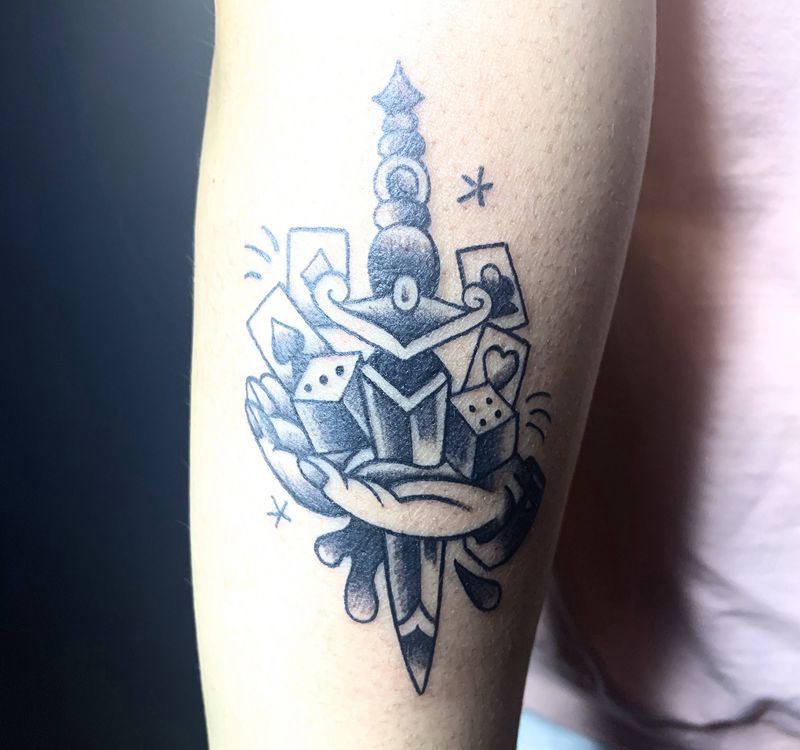 当前位置: 首页 >天津市纹身店-皆刺青纹身工作室纹身图案>school匕首骰子纹身图片_手臂Old SchoolNew School匕首骰子手纹身图案
