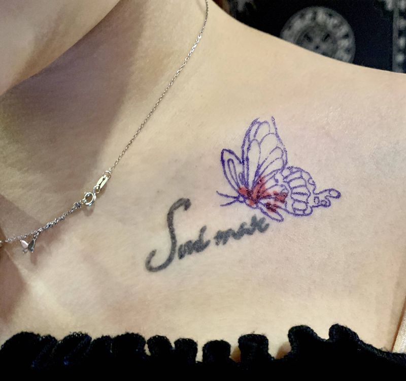 胸口修改遮盖字母蝴蝶纹身图片_胸部欧美写实花体字字母蝴蝶遮盖纹身图案