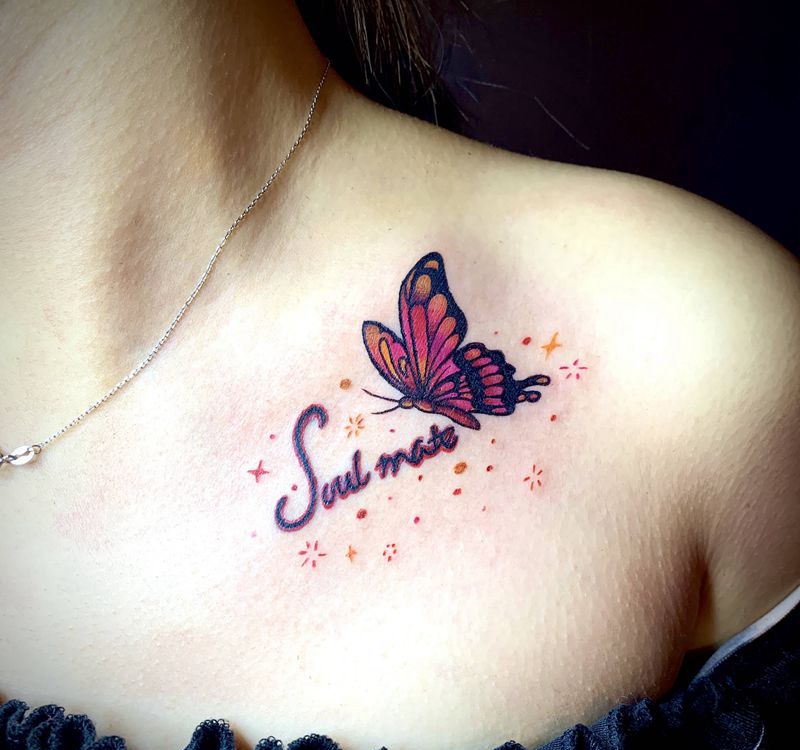 胸口修改遮盖字母蝴蝶纹身图片_胸部欧美写实花体字字母蝴蝶遮盖纹身图案