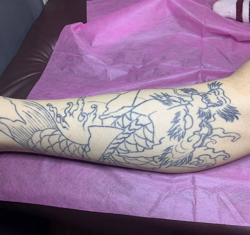 • T网红王老大花腿龙纹身图片_腿部新传统纹身图案