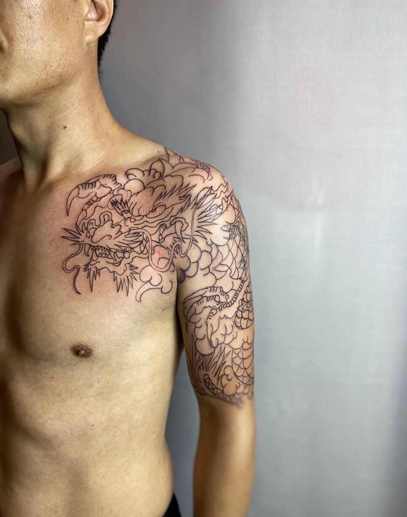 • T网红王老大花腿龙纹身图片_腿部新传统纹身图案