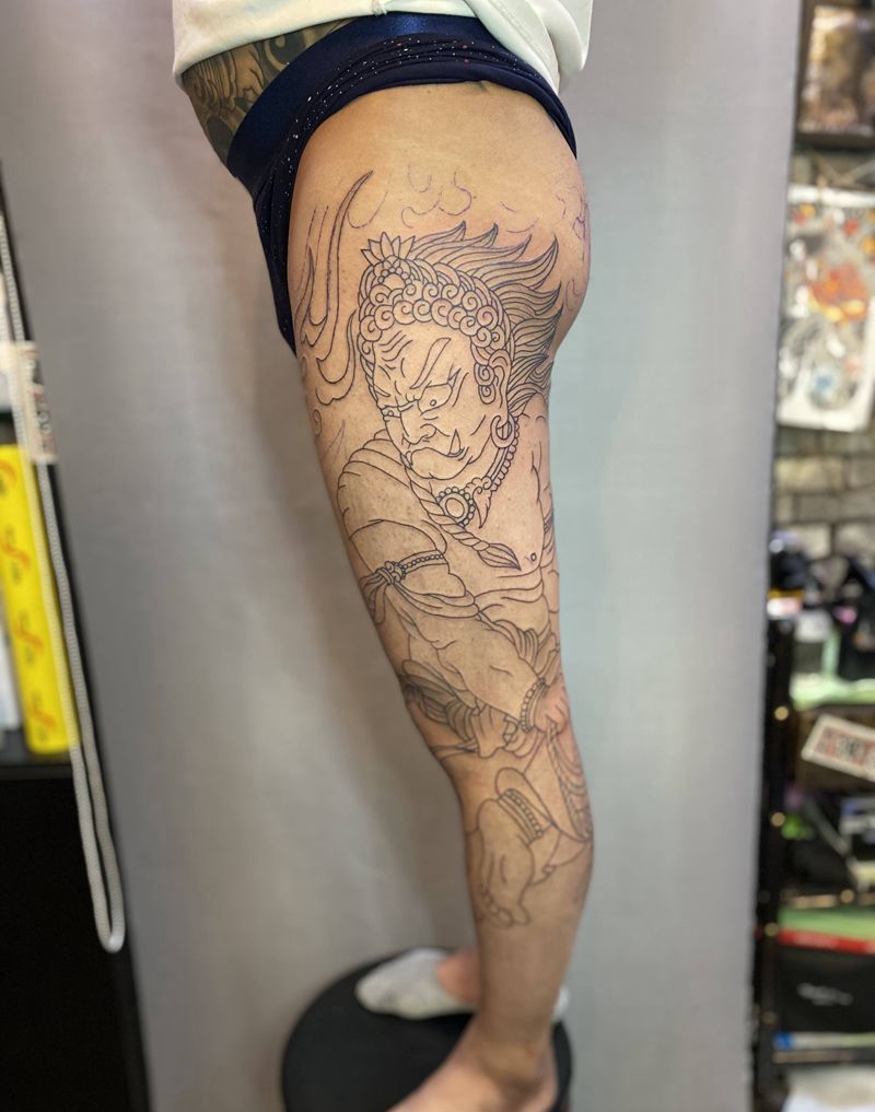 明王初步主题线条下次背景纹身图片_腿部老传统纹身图案