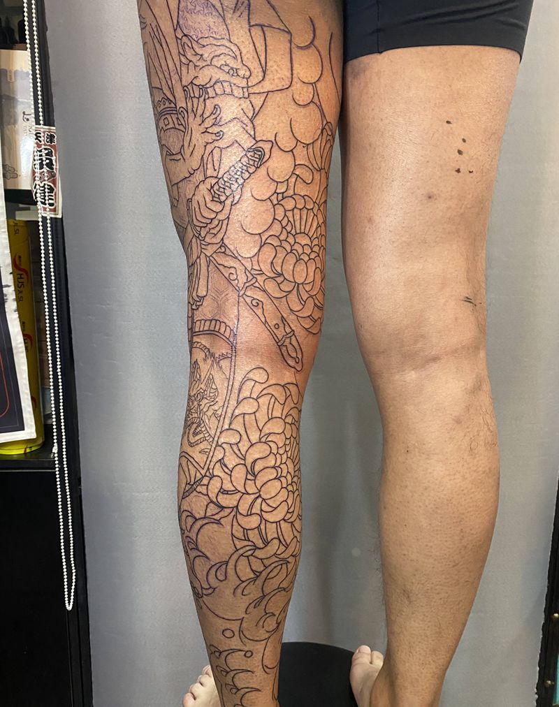 • T网红王老大花腿龙纹身图片_腿部新传统纹身图案