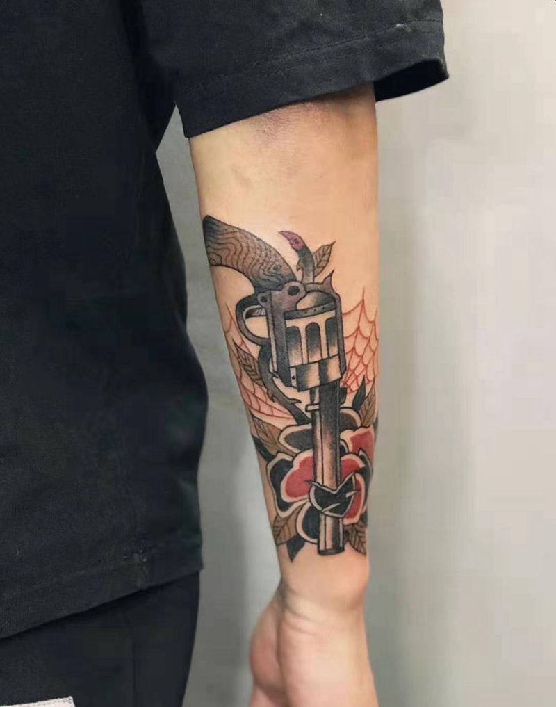 手枪玫瑰纹身图片_手臂手部Old School纹身图案
