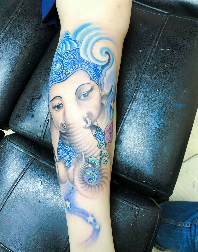 当前位置: 首页 >天津市纹身店-墨谷纹艺刺青纹身图案>可爱小象神纹身图片_手臂腿部新传统水彩纹身图案
