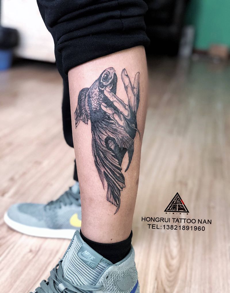 当前位置: 首页 >天津市纹身店-解忧文身店纹身图案>掌中鱼纹身图片_腿部纹身图案