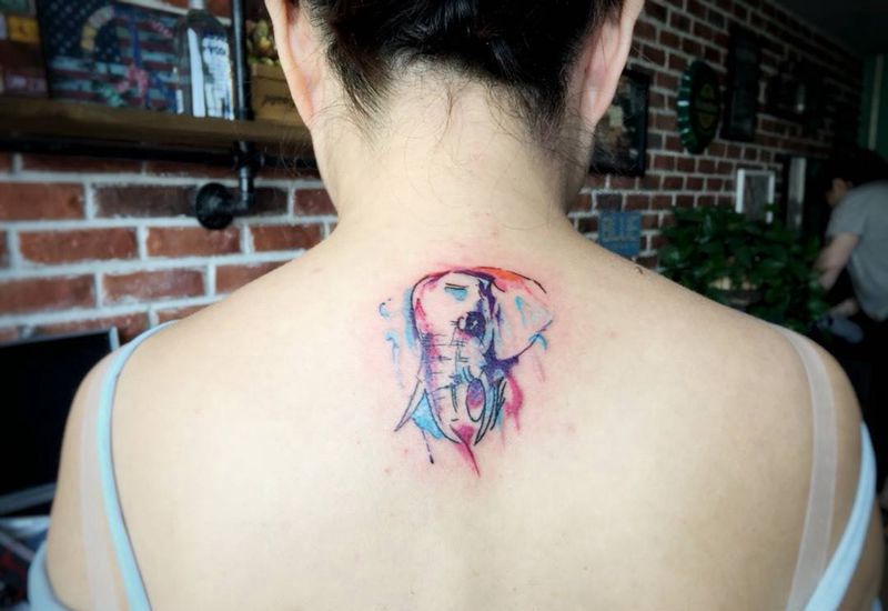 当前位置: 首页 >天津市纹身店-解忧文身店纹身图案>彩色泼墨小象纹身图片_清新动物背部纹身图案