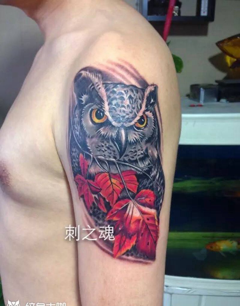 当前位置: 首页 >天津市纹身店-刺之魂艺术纹身纹身图案>猫头鹰纹身图片_成品肩部写实欧美动物原创纹身图案