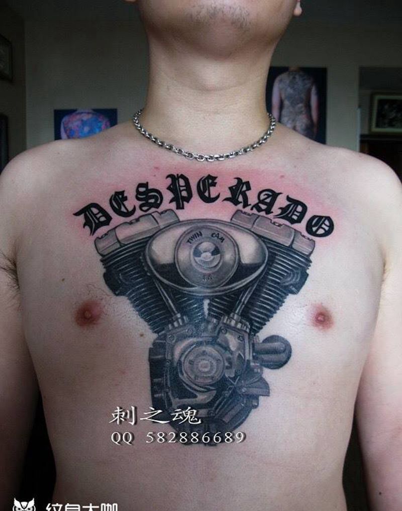 哈雷发动机纹身图片_成品胸部欧美写实原创纹身图案