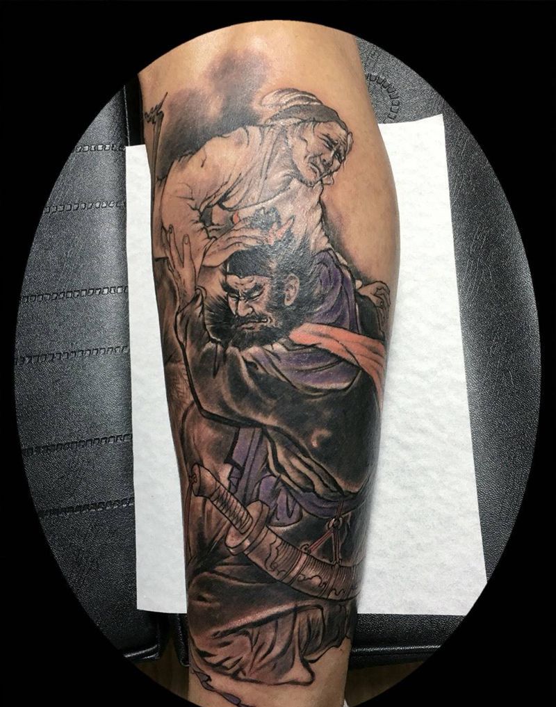 李逵探母纹身图片_人物原创腿部国画纹身图案