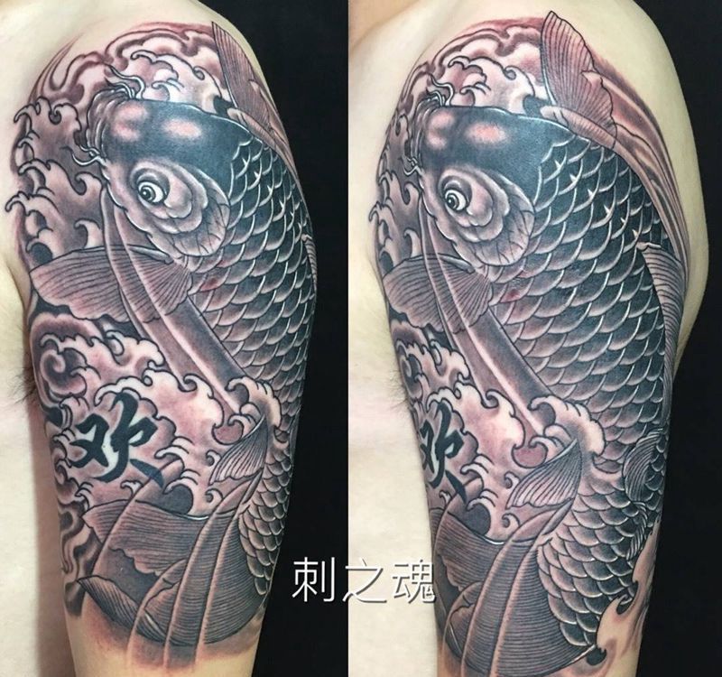 当前位置: 首页 >天津市纹身店-刺之魂艺术纹身纹身图案>鲤鱼纹身图片_成品肩部传统原创纹身图案