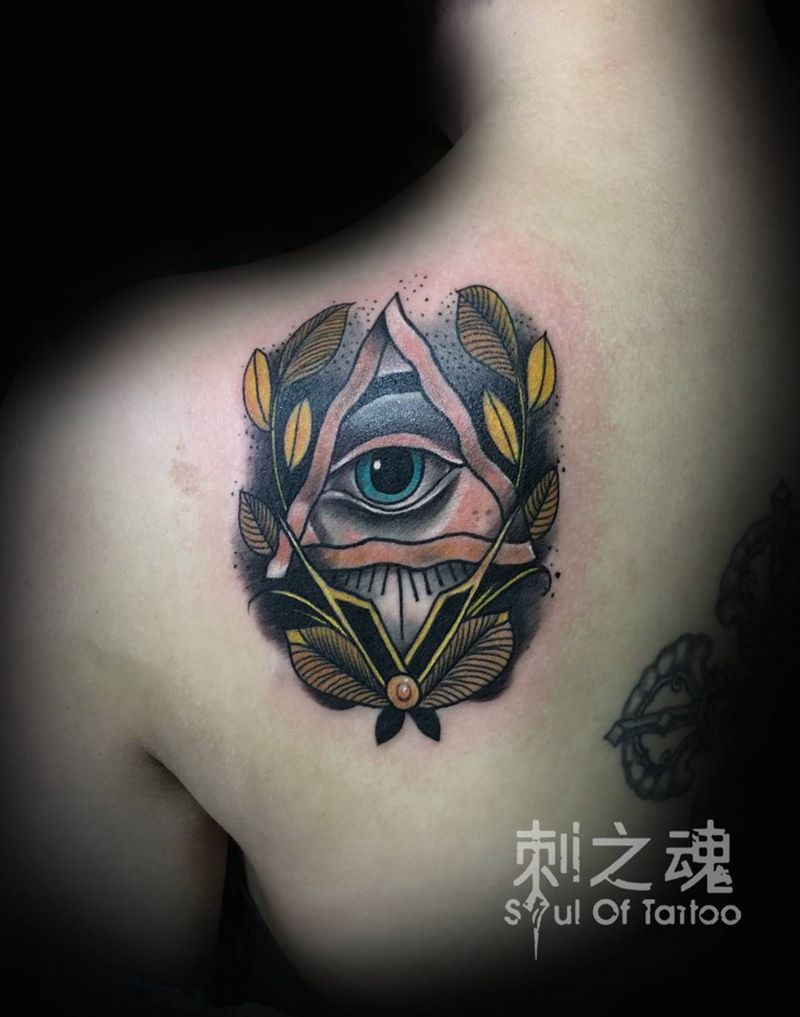 当前位置: 首页 >天津市纹身店-刺之魂艺术纹身纹身图案>上帝之眼纹身图片_成品肩部传统写实宗教原创纹身图案